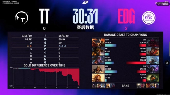 第二局AKi皇子前期想找节奏但是连续两次反而都被EDG化解自己还白给了!TT哪怕有前期的优势但是没什么推进的节奏,反而是Xiaohao猴子ID一遮打的像Tarzan,要反蹲有反蹲,要gank开团有gank开团,中期EDG一波小龙团,一波下路埋伏找回节奏,SeTab阿萝拉状态低迷直接被新人辅助Parukia泰坦逮捕!EDG中野上路逮捕HOYA兰博拿下大龙扩大优势,高地团Parukia泰坦两钩连续命中!EDG打出人数差结束比赛!收获4-0小局的大场两连胜!