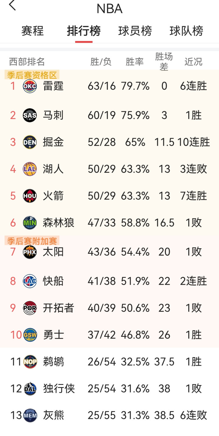 北京时间2026年4月9日,NBA常规赛西部赛场传来关键战报,丹佛掘金坐镇主场以136-119大胜孟菲斯灰熊,豪取10连胜的同时,直接敲定了湖人的季后赛排位命运。掘金凭借这场胜利将战绩提升至52胜28负,手握11.5个胜场差的优势,领先排名第四的湖人1.5个胜场。常规赛仅剩两场对决,对手分别是马刺和雷霆,两支球队的排位均已确定,不会在收官阶段全力拼抢。湖人想要完成反超,不仅需要自己全胜,还要目送掘金连败两场,这样的可能性几乎为零。西部第三的位置已经被掘金牢牢握在手中,湖人彻底失去了争夺上游排位的机会,也只能接受在季后赛潜在对阵中处于劣势的局面。