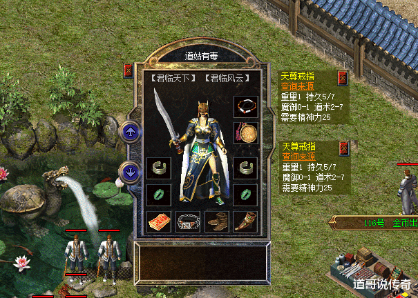 第四 ,高道戒指敏捷套道士的主要道术加持就在武器和戒指方面,如上图所示,这对天尊戒指也是复古版本的道戒天花板,目前老道就在新百区见过一枚道8天尊戒指,因此这对天尊戒指的档次也是极高的。综上所述,这位女道士的穿搭集合了高道术,高敏捷,高防御以及高准确的属性加持,大家觉得档次如何呢?欢迎留言交流。