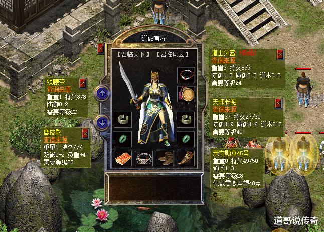 第二,高防服饰系列道士职业在复古版本加防御也是常见的穿搭,如上图所示,这位道姑的道士头盔比较稀罕,不仅有2点道术属性加持,而且还多加了1点道术属性上限。天师长袍和荣誉勋章45号都是顶级系列,搭配的铁腰带和鹿皮靴增加了4点防御属性上限和4点负重。整体来看这服饰系列有高防御和高道术加持,确实优秀。