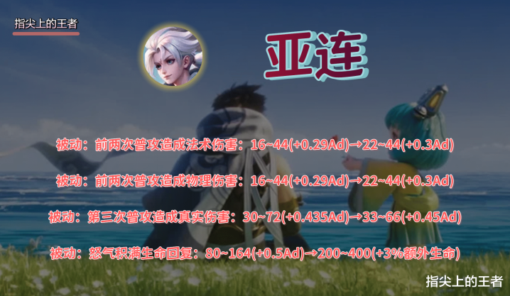 亚连小王子终于是加强了,不过而后想的不一样,策划的调整方式更加直接且粗暴,我们想要的线上续航、留人能力统统没有,而是直接加强了普攻伤害和被动回血。