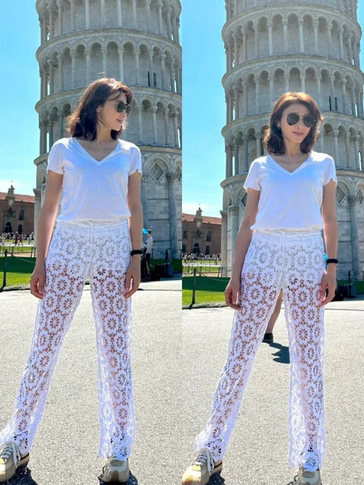 当然黎姿的好身材也是加分项,白色V领T恤搭配了白色蕾丝直筒裤,这种考验身材的裤子,如果发福的中年人穿,也许是灾难。