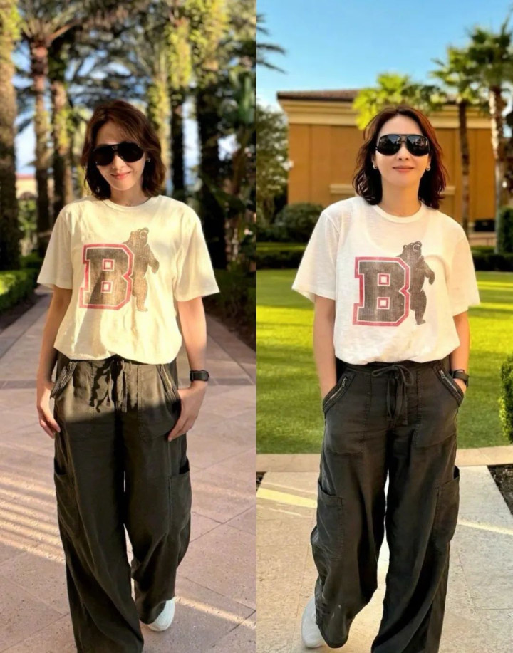 而T恤也成为她度假时的时尚单品,黎姿选了字母印花的白T恤,搭配军绿色抽绳工装裤,踩小白鞋,佩戴墨镜,又酷又帅!