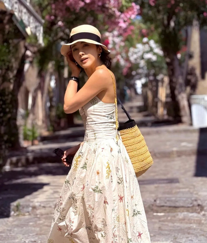 除了纯白色的长裙,浅色系的吊带印花裙,背一款编织包,一顶米色编织大檐帽,脚踩一双人字凉拖鞋,度假松弛感溢出屏幕。