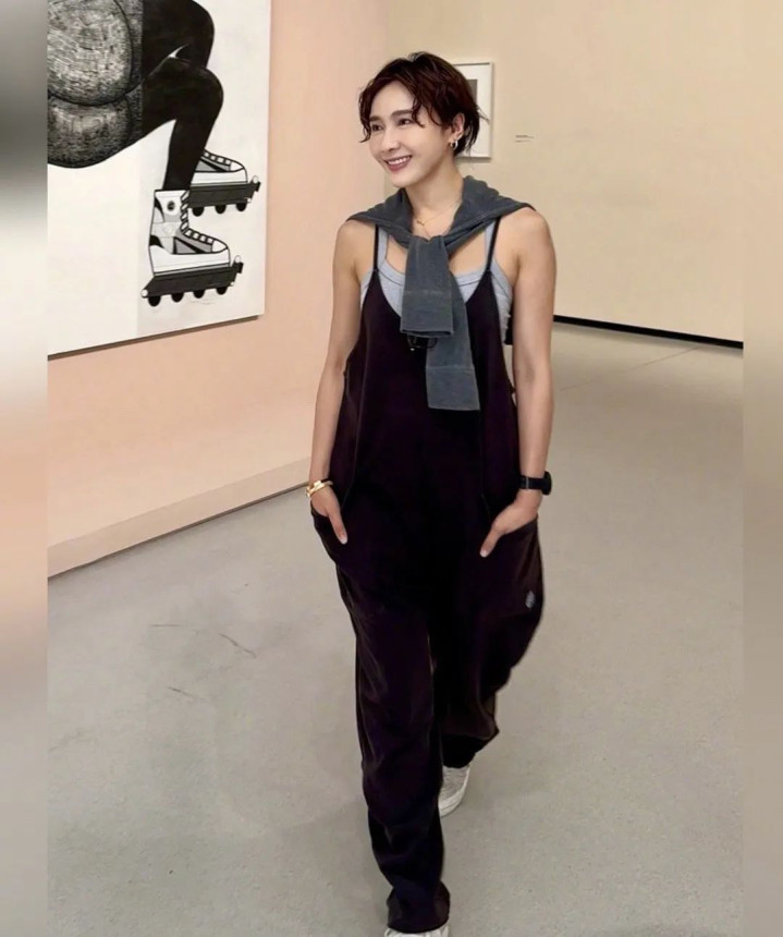 在旅行中的黎姿,穿搭看起来舒适又简约,把基础款穿出了高级感!⬇️简约的灰色吊带搭配背带裤打造不经意的时髦感。