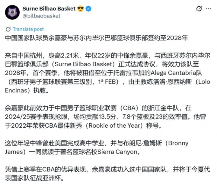 毕尔巴鄂篮球俱乐部官推则用中文进行了官宣,全文如下: