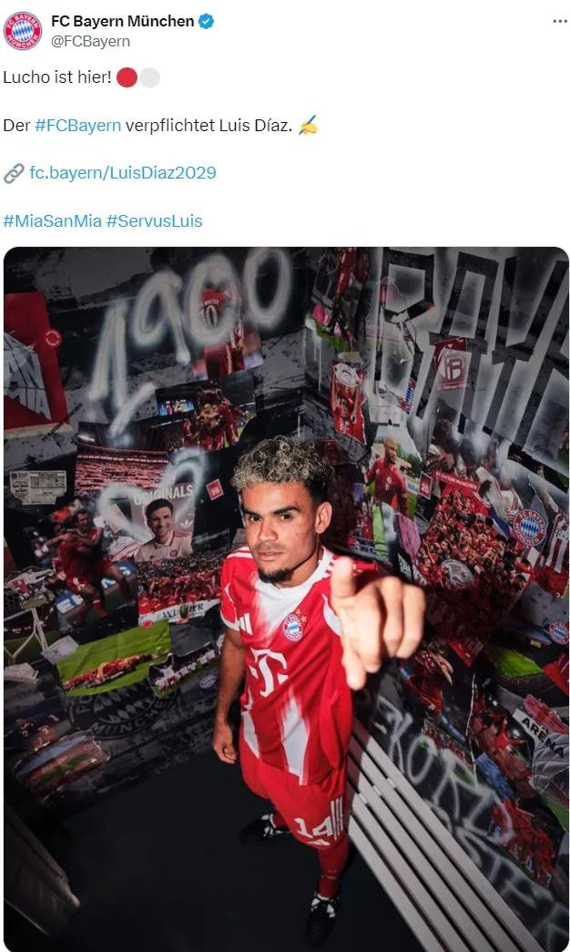 官方:拜仁宣布从利物浦签下了路易斯-迪亚斯。