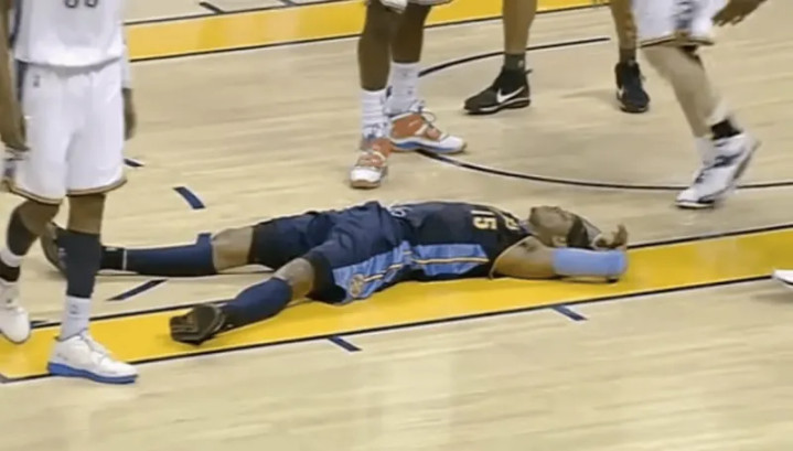 这时,尼克-科里森已经机警地把球从安东尼怀里抢过来(说是抢,其实完全没费力),准备发界外球,但后者完全没有起身的迹象,还躺在地下喘着粗气。雷霆主场球迷已经嘘声四起,他们认为这只是安东尼拖延比赛的“诡计”。