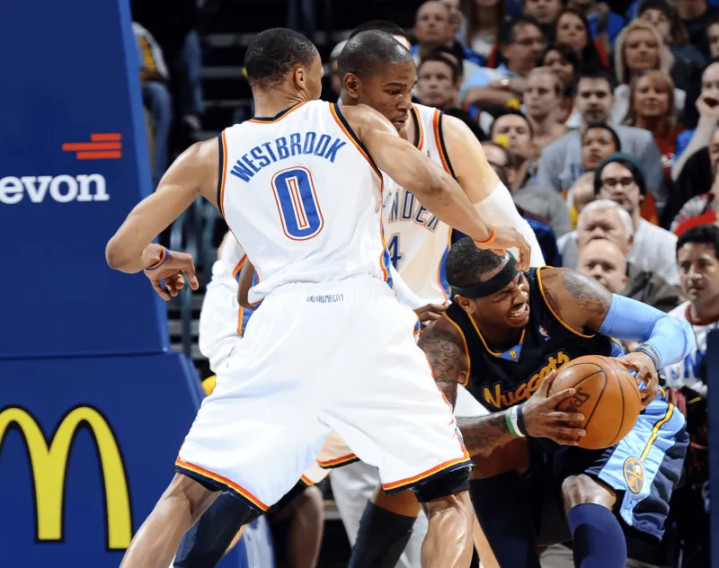就在第三节行将结束时,雷霆正打出一波13-2的高潮,安东尼在右侧肘区对上了杜兰特。双方空间异常拥堵,场上十名球员有九名都驻扎在禁区。安东尼拿出招牌的三威胁姿势,快速观察形势后,选择交叉步向左侧突破。