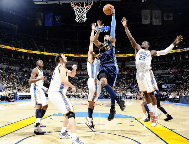 2010年4月8日,掘金做客俄克拉荷马城。这是两队赛季第四次交手,掘金拿下了前两个主场,合计赢了雷霆28分,而雷霆则在主场送给缺少安东尼的掘金17分惨败。这场比赛雷霆在球馆上层开放了更多临时座位,入场观众创下了赛季最高的18332人。