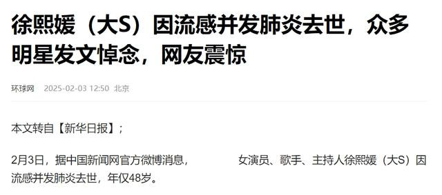 1、环球网(2025-2-3):《徐熙媛(大S)因流感并发肺炎去世,众多明星发文悼念,网友震惊》