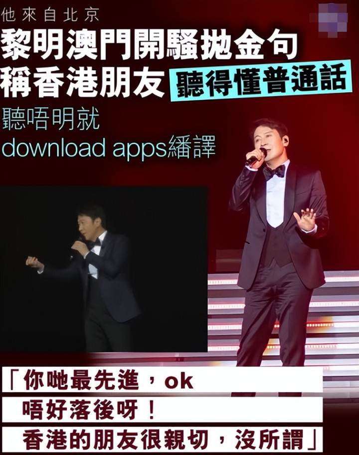 其实陈奕迅在新疆棉花风波时,宣布与国外的某个品牌解约,用真金白银去维护国家,没想到会因为拒绝说普通话而被网暴,澳门是讲粤语的地方,说粤语是比较常规的做法,像黎明、张学友在澳门都会说粤语,但他们情商比较高,用幽默方式回答,黎明今年澳门开演唱会,还喊话香港的朋友一起学普通话。