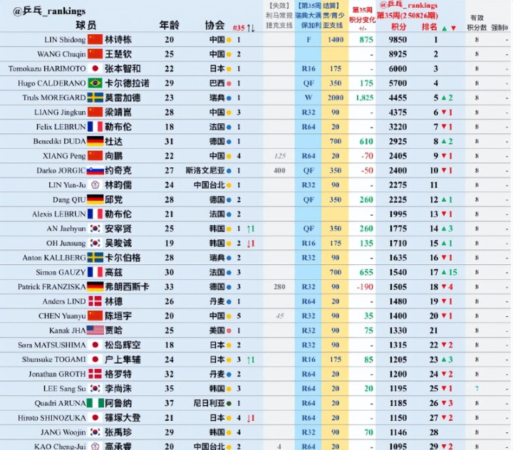 小莫在本届大满贯夺冠后,算上失效的积分他也要+1825分,他总分4455分,世界排名升至第五位,梁靖崑下滑到第六。