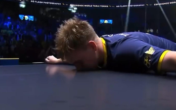 小莫直接倒在了球台上,缓了几秒后他亲吻了球台,球拍与球台都进行了亲吻,小莫还是在激动之中。