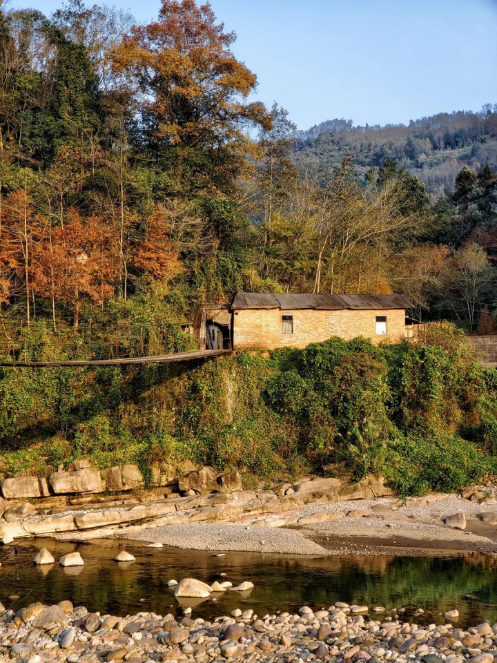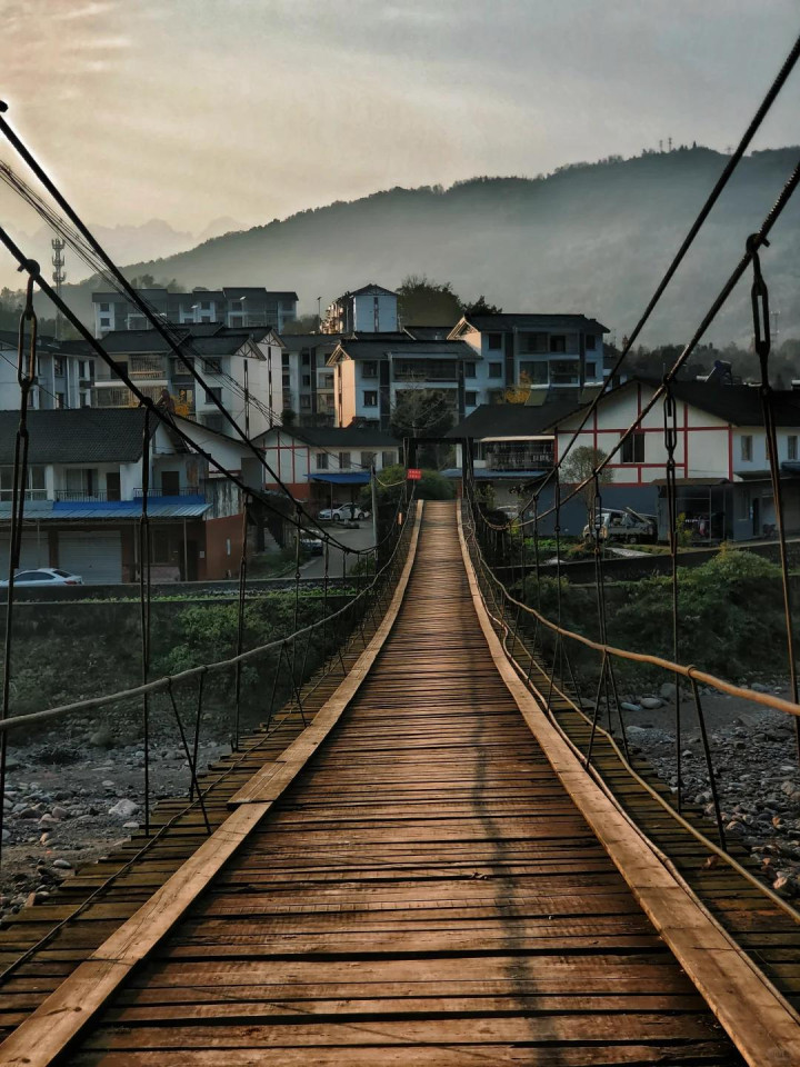一开场就是惊喜,“源桥”横跨在䢺江上,最先撞见的是那座晃悠悠的吊桥,钢索拽着旧木踏板,走过桥,红砖房的淡烟裹在风里飘,乡村风格十足。