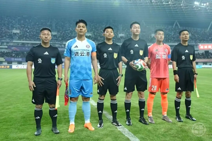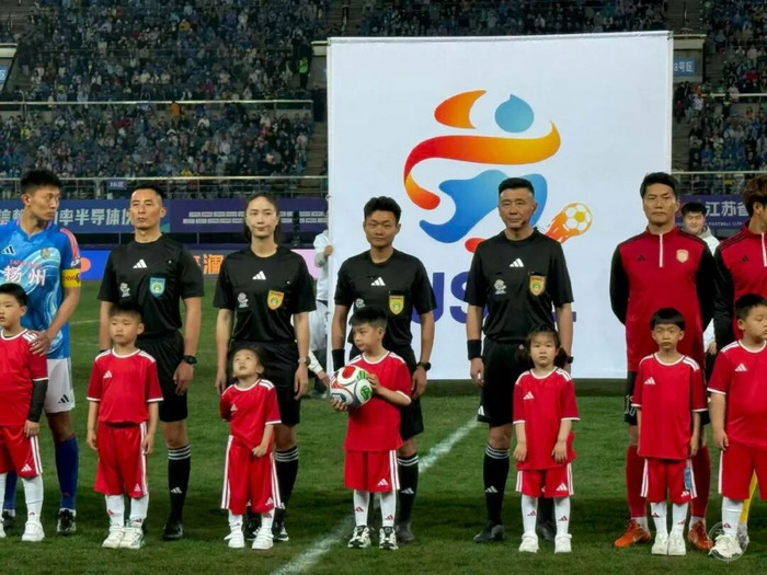 在扬州队对阵苏州队的比赛中,来自无锡一中的张榕佳老师(上图二排左三)担任第四官员,成为今年首位执法“苏超”的女裁判。而天一中学的陆磊老师(下图左一)在连云港队与盐城队的比赛中担任第二助理裁判,这是他连续第二年执法“苏超”。