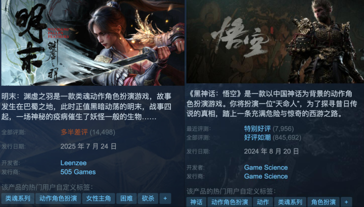 《明末:渊虚之羽》与《黑神话:悟空》在steam平台上的评分对比。