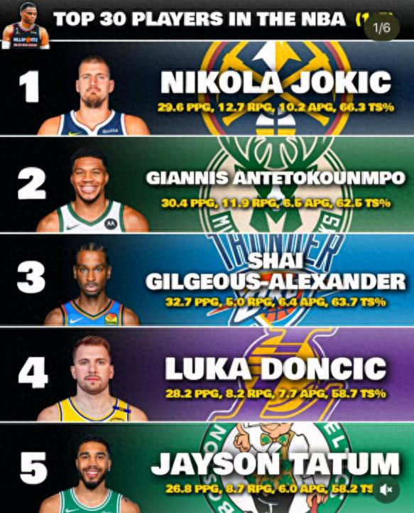 1-5:尼古拉-约基奇、扬尼斯-阿德托昆博、谢伊-亚历山大、卢卡-东契奇、杰森-塔图姆;