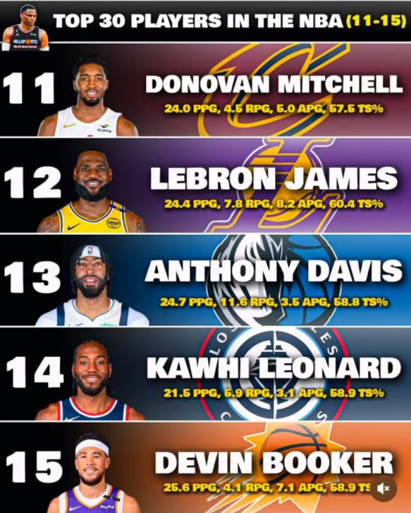 40岁的勒布朗排在浓眉、伦纳德、布克前面肯定有人觉得存在争议,可上赛季的勒布朗还是最佳二阵这一点大家需要清楚。