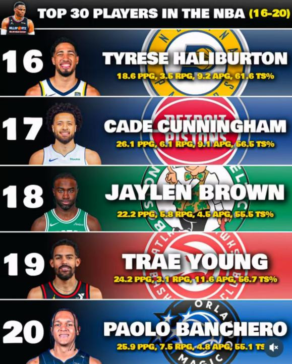 16-20:泰雷斯-哈利伯顿、凯德-坎宁安、杰伦-布朗、特雷杨、保罗-班凯罗;
