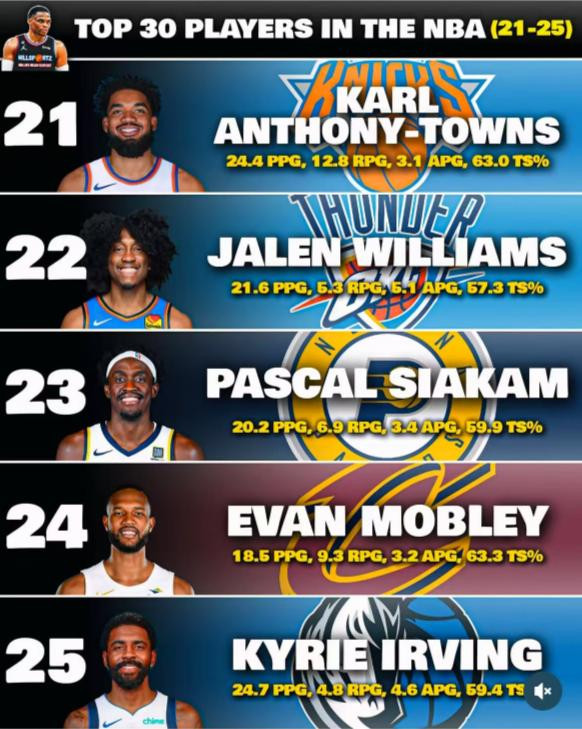 21-25:卡尔-安东尼-唐斯、杰伦-威廉姆斯、帕斯卡尔-西亚卡姆、埃文-莫布利;凯里-欧文;