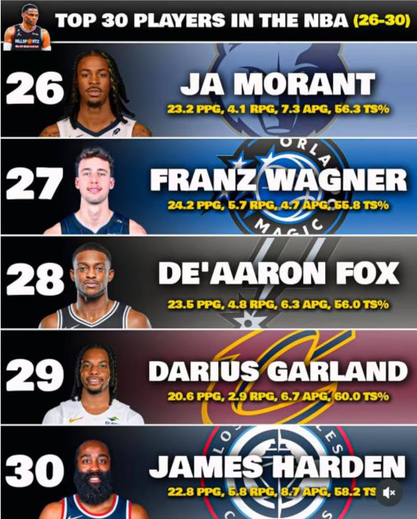 26-30:贾-莫兰特、弗朗茨-瓦格纳、达龙-福克斯、达柳斯-加兰、詹姆斯-哈登。