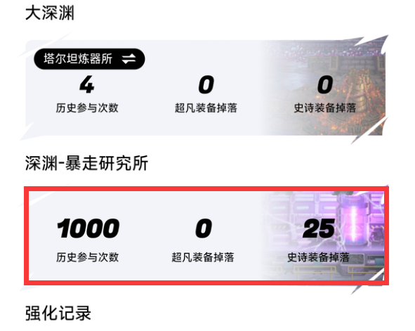 而且之前在玩家中还流传着深渊保底的说法,就是刷一千次深渊必定保底能出一件超凡装备。但是这次深渊超凡保底终于还是被证实了,被证实是不存在的。有玩家秀出了自己的深渊记录,可以看到这名玩家刷了1000次新深渊了,竟然还没有爆出一件超凡装备,看来这所谓的一千次深渊保底只是玩家的自我安慰罢了。不得不说这名玩家是真的脸黑,刷了1000次深渊没有刷到超凡装备就算了,这也才爆出25件史诗。还好这次超越地下城的加入,让大家毕业更加容易了。