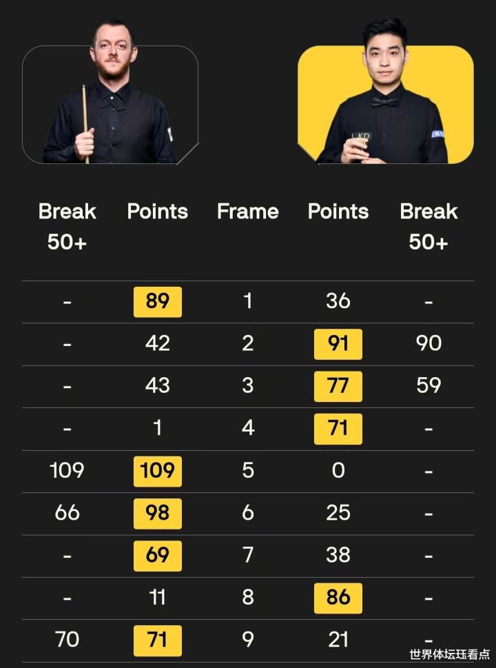 第九局,斯佳辉率先在比赛中出现失误,随后艾伦拼进红球获得上手机会。最终,艾伦单杆打出70分的表现以71:21拿下此局从而5-4绝杀斯佳辉进四强。