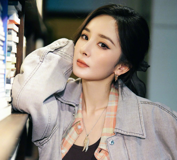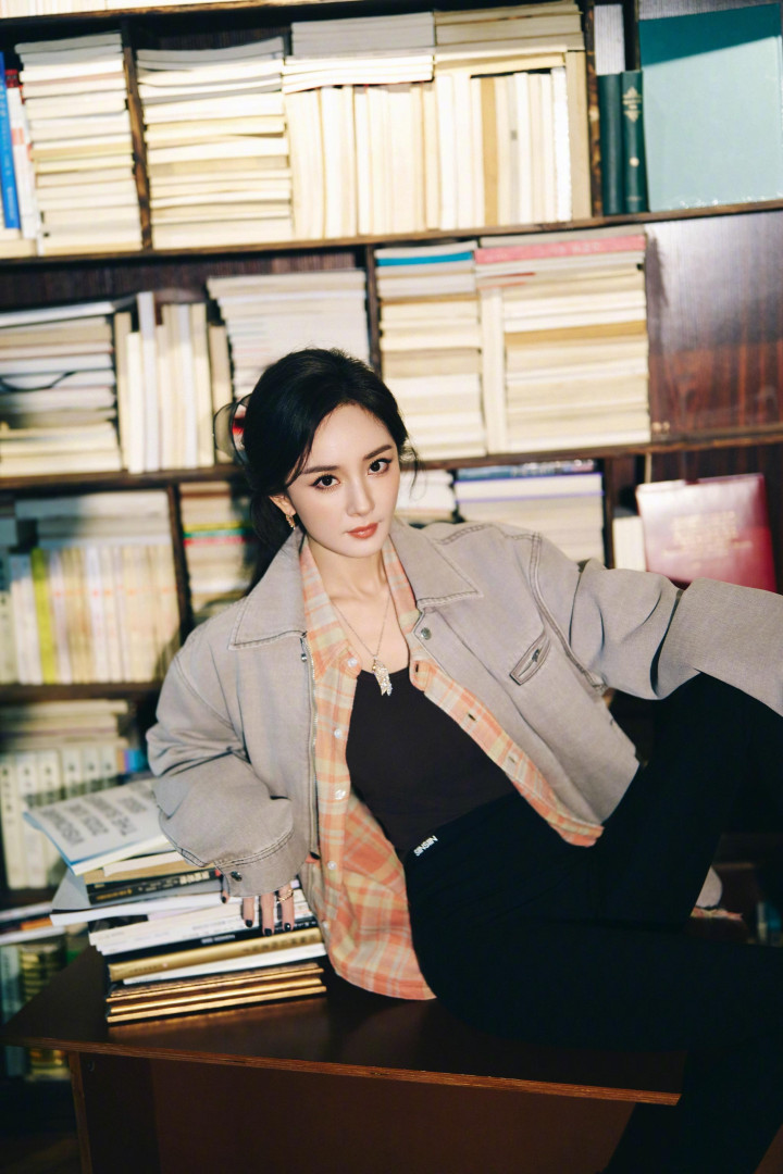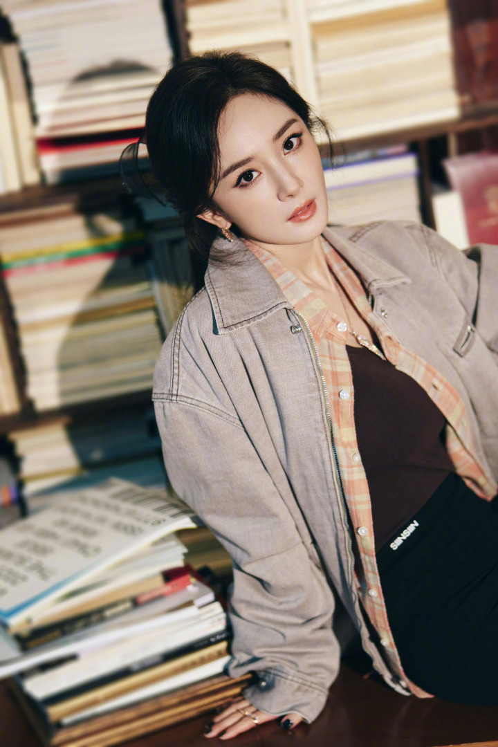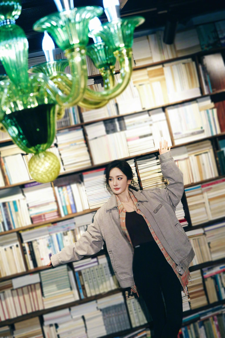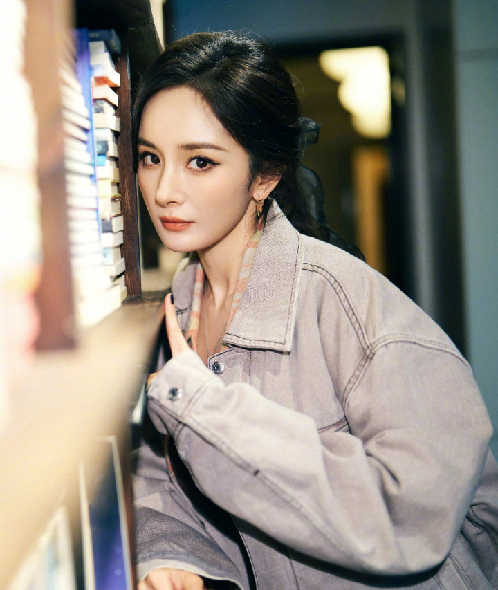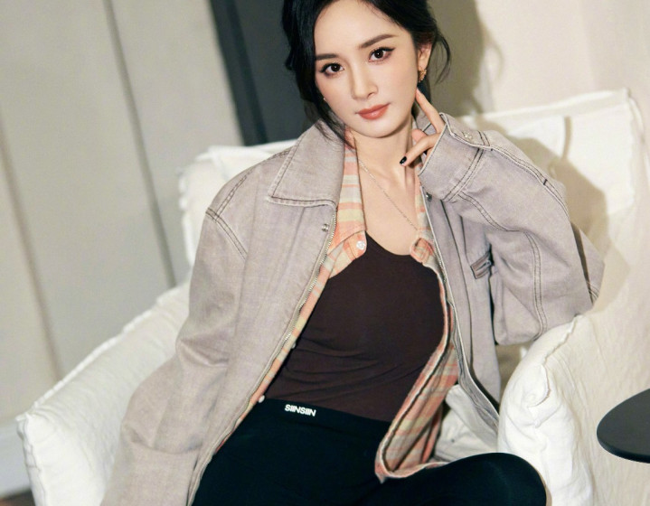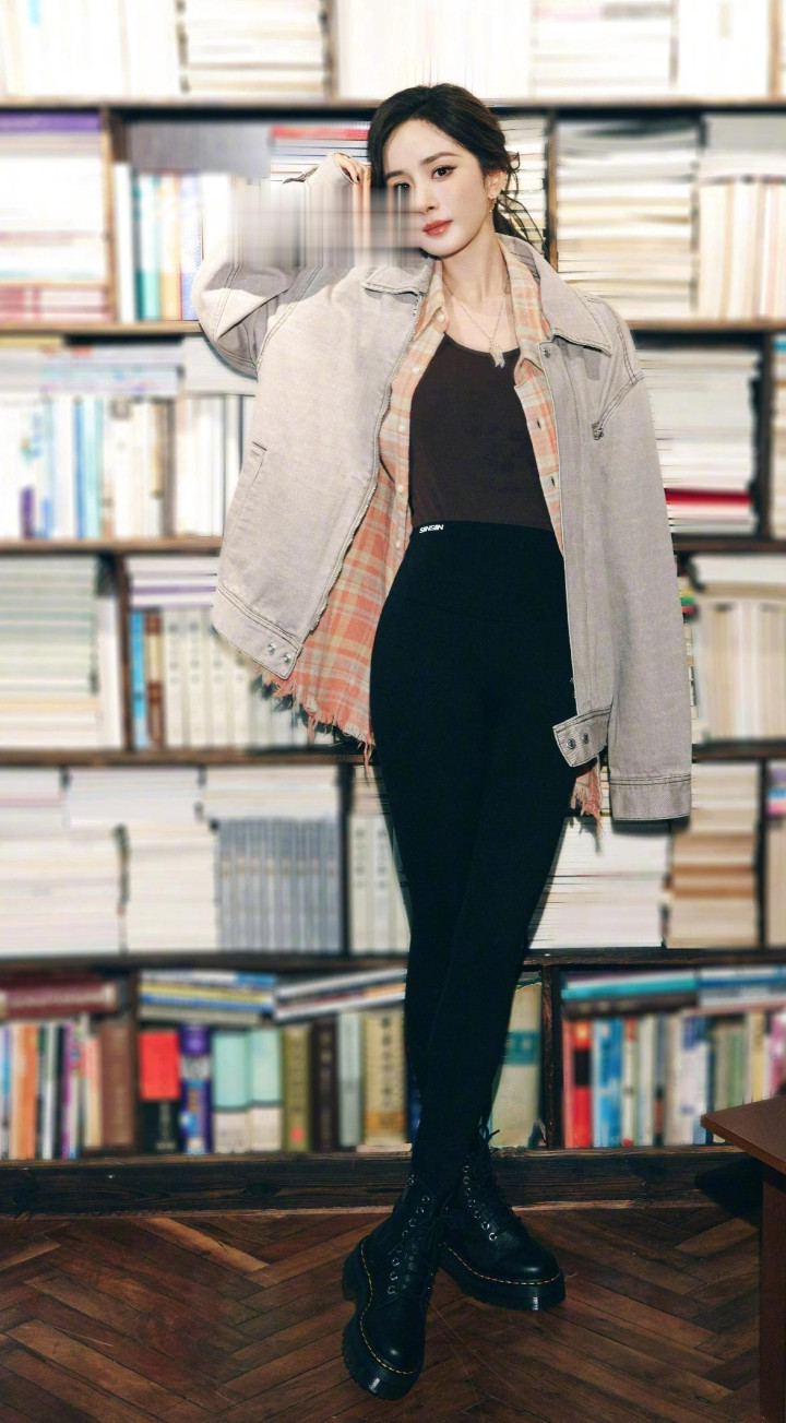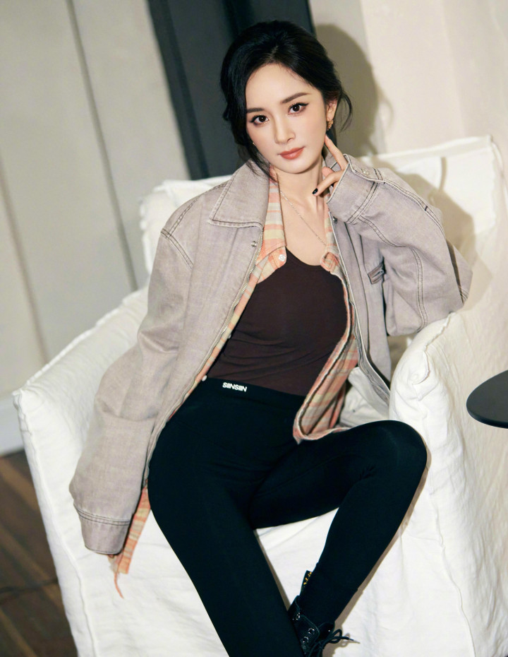 杨幂拍摄花絮, 身穿牛仔外套黑色紧身裤, 秀起细腰和细腿