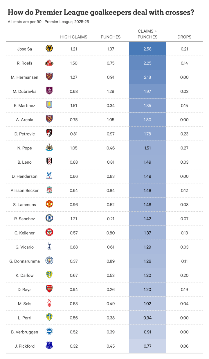 TA统计英超门将应对传中: 大马丁抓球最多, 豪门门将数据低