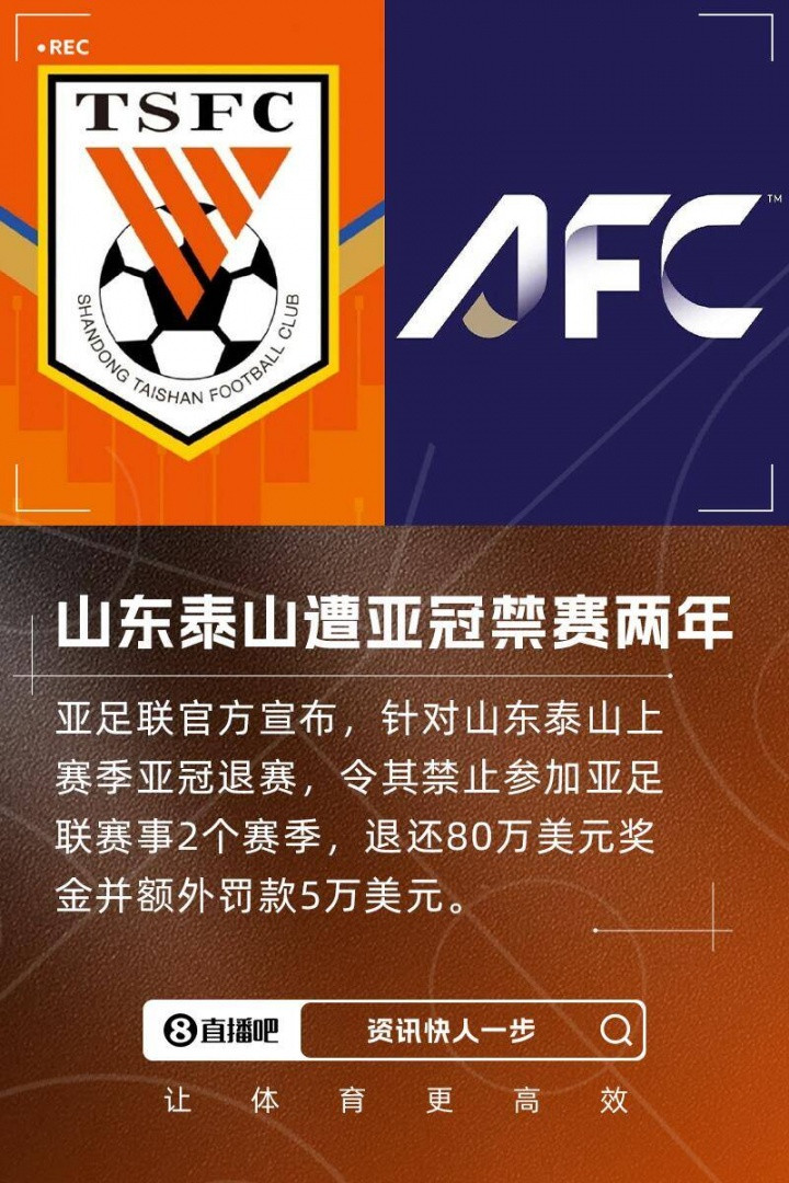 亚足联官方: 禁止山东泰山参加亚足联赛事2个赛季, 罚款50000美元