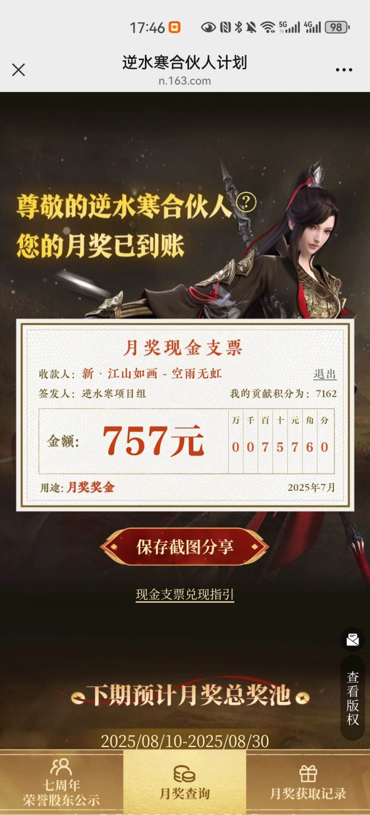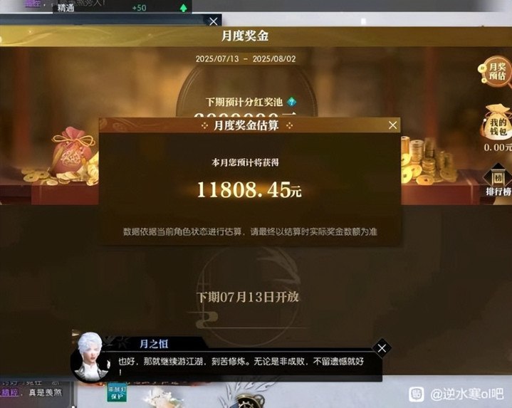 8月3日,《逆水寒》黄金服首个月月奖奖励正式发放,首个月月奖金额就高达1000万元人民币,根据活跃度的高低,有数万玩家都获得了“领薪”资格,而薪水的额度也大大超乎玩家们的意料——有人花了2000块人民币买了个账号,一分钱没有投入并正常获得游戏收益的情况下,月奖收益还有几百元之多;有大佬更是晒出了自己超过两万元的月奖奖金,表示:玩了这么多年游戏,第一次从厂商这里见到了回头钱!