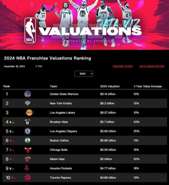 时至今日,篮网队在2024-25赛季的估值已经高达57亿美元,同比去年提升了43%,在联盟中排名第四,仅次于勇士、湖人、尼克斯这三支传统豪门。而考虑到篮网队所处的纽约这一国际化大都市所带来的巨大市场影响力、球队中众多球星的商业效应以及球队自身的品牌价值等多方面因素,蔡崇信若选择在此时出售篮网队,再算上巴克莱中心等相关资产,总成交价极有可能在60至65亿美元之间。这样的数字,无疑让人们对蔡崇信的商业头脑和投资眼光刮目相看。