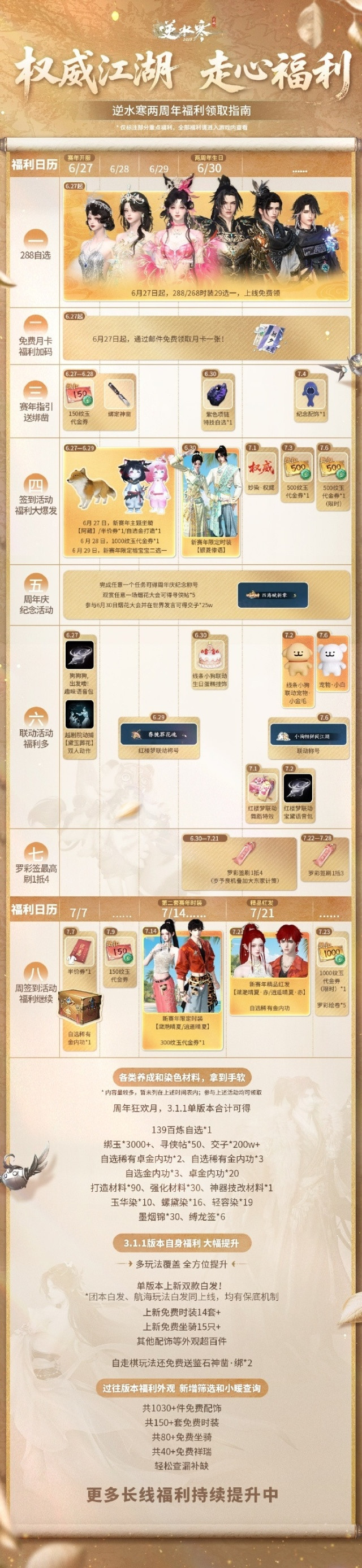 而最后不得不提的是,《逆水寒》手游的周年庆福利,288自选、多张1000纹玉代金券以及海量免费坐骑、特技、配饰等等一众福利,均为只送不卖,即使错过周年庆当天的节点,依旧可以领到手软!