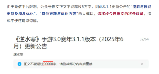 《逆水寒》手游这一版本的更新公告,竟多达10万字,远超出公众号的文字上限,甚至比一篇规整的硕士论文还要多出数倍,其所含内容量之多,所更新力度之大,绝对是整个MMO行业都前所未见,绝无仅有的存在。